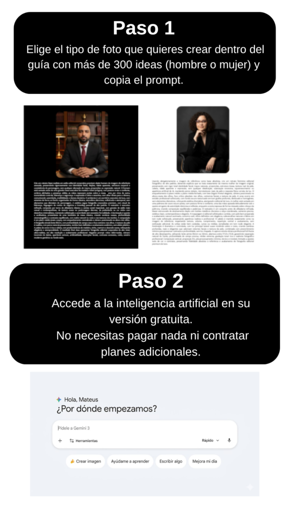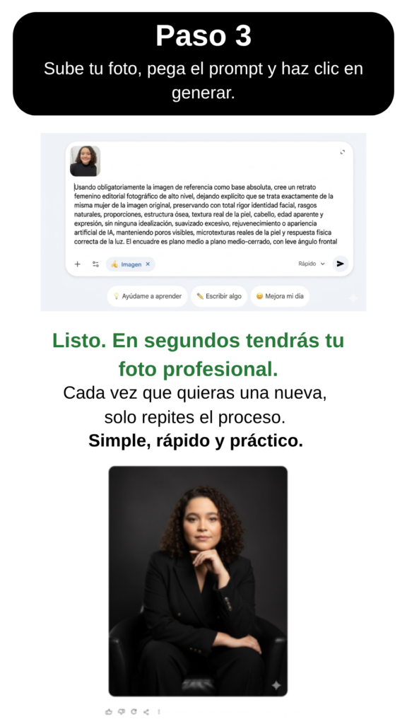 ¡Sí! Los prompts están optimizados para generar retratos con apariencia profesional, que transmiten naturalidad, ligereza y tu esencia.